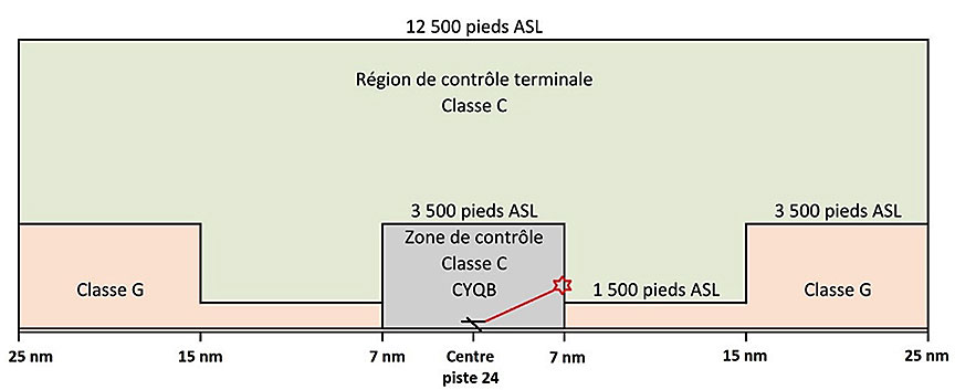 CYQB se trouve dans un espace aérien contrôlé de classe C. Tous les aéronefs doivent obtenir une autorisation du contrôle de la circulation aérienne (ATC) avant d'y pénétrer. Un espace aérien de classe G est un espace aérien dans lequel l'ATC n'a ni l'autorité ni la responsabilité d'exercer un contrôle sur la circulation aérienne. La collision a eu lieu dans une zone de contrôle de classe C (Figure 3).