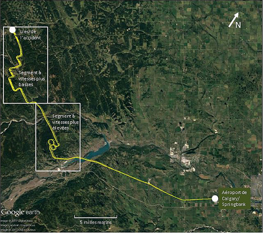 Le 13 février 2017 à 16 h 34Note de bas de page 1, le Tecnam P2006T (immatriculé C-GRDV, numéro de série 088) de la Mount Royal University a décollé de l'aéroport de Calgary/Springbank (CYBW) (Alberta). À son bord, il y avait un instructeur de vol et un pilote qui suivait une formation au pilotage d'aéronef multimoteur (l'élève). Pour ce dernier, il s'agissait de son premier vol d'entraînement en vue d'obtenir la qualification multimoteur. L'aéronef a fait route vers le nord-ouest en montant à 8000 pieds au-dessus du niveau de la mer (asl). Étant donné le relief dans cette région, cette altitude équivaut à 2500 à 3000 pieds au-dessus du niveau du sol (agl).