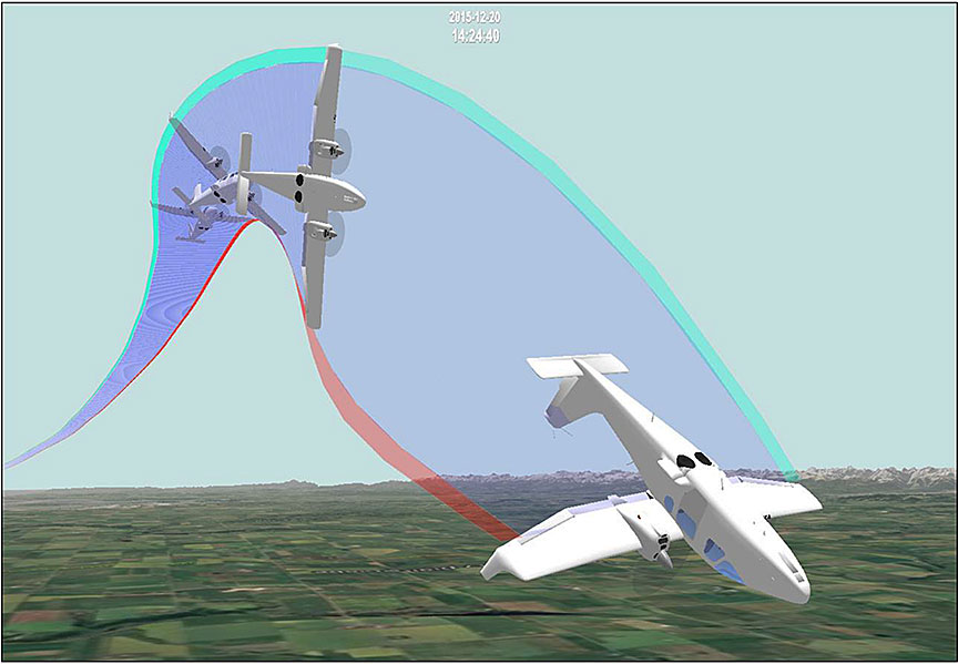 L'aéronef a ensuite ralenti. Le reste de ce segment s'est déroulé à des vitesses anémométriques plus faibles et comprenait une série de virages à 90° en alternance à des angles d'inclinaison de 20° à 30° et à des vitesses variant de 65 à 80 KCAS. Les 2 segments de vol se sont déroulés à 8000 pieds asl, avec très peu de variation d'altitude.