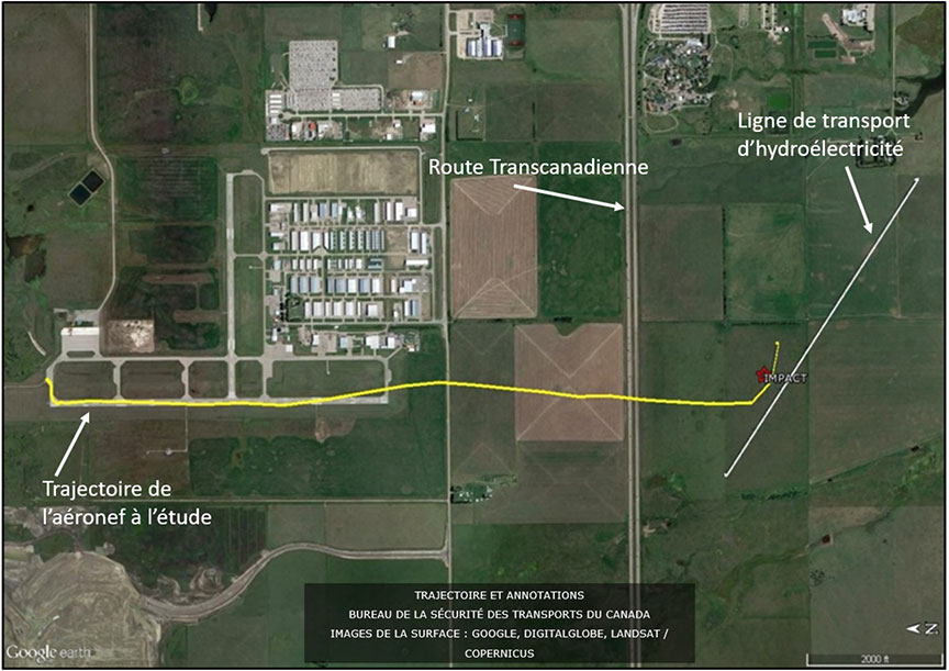 L'aéronef a alors amorcé un virage serré descendant incliné à gauche, à environ 300 pieds au nord de lignes de transport d'hydroélectricité allant d'est en ouest. La vitesse anémométrique estimée a diminué à quelque 65 KCAS lorsque l'aéronef se trouvait à une altitude approximative de 100 pieds AGL (figure 1 et figure 2).