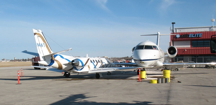 L'aile droite du Cessna a ensuite percuté le train avant d'un aéronef Bombardier CL-600-2B16 (Challenger 605) de Morningstar Partners Ltd. (immatriculé C-FXWT, numéro de série 5824), qui était stationné face au Cessna. Lorsque l'aile droite du Cessna est entrée en contact avec le train avant du Challenger 605, le Cessna a pivoté vers la droite et son train avant a touché l'aile droite du Challenger 605 (figure 1).