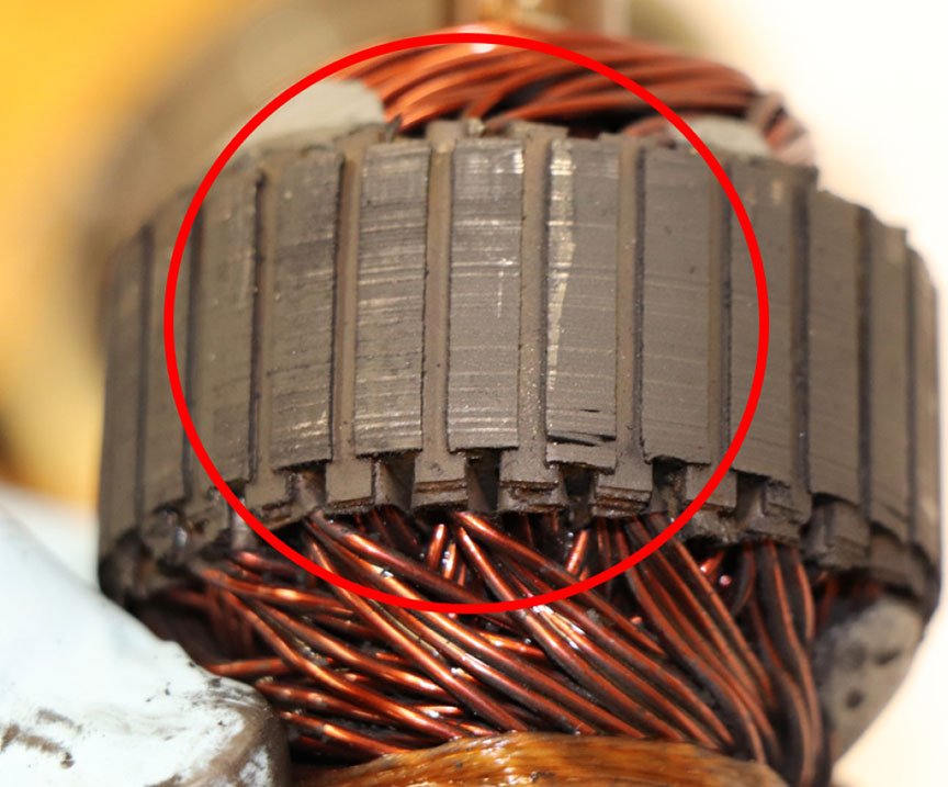 L'examen de l'aéronef sur place par le BST et les essais en laboratoire réalisés par la suite sur l'ensemble moteur et pompe hydraulique ont permis de constater que celui-ci était inopérant. Le démontage du moteur a révélé une usure excessive des paliers d'induit et des éraflures sur l'induit (figure 3) et le stator (figure 4). Ces éraflures indiquent qu'il y aurait eu frottement et grippage de l'induit contre le stator.