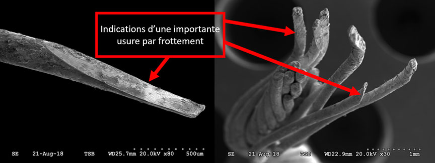 - 52 (39 %) des fils rompus présentaient une importante usure par frottement (figure 2), ce qui a contribué à leur rupture. Ces ruptures sont probablement survenues avant la surcharge en tension.