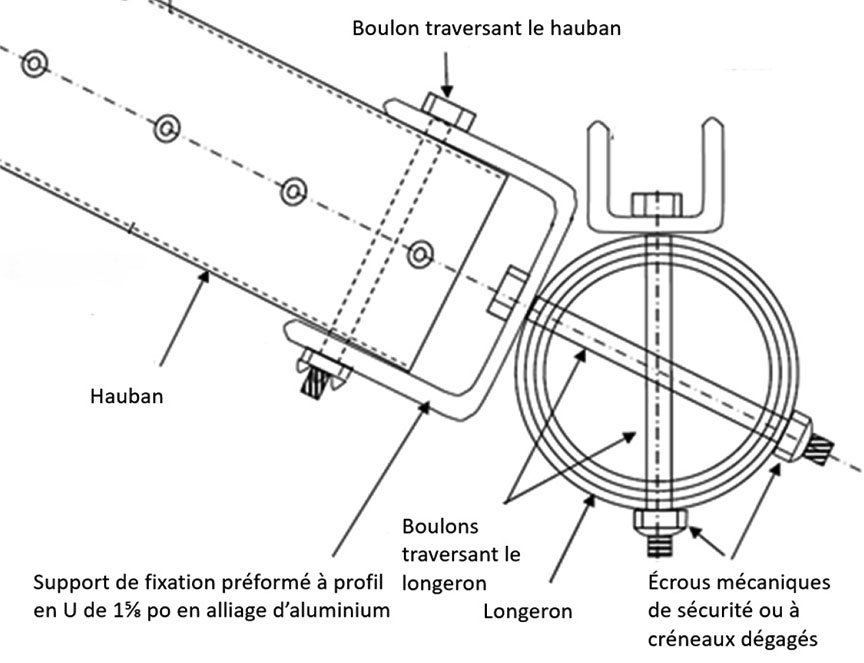 Les ailes sont soutenues par des haubans qui sont fixés au fuselage par des supports de fixation préformés à profil en U de 1⅝ pouce en alliage d'aluminium. On attache ces supports de fixation aux haubans par un boulon qui traverse les trous de boulon dans chaque branche du support et dans un trou préalablement percé dans le hauban. Ces supports de fixation et les haubans sont ensuite fixés au longeron de fuselage au moyen d'un boulon qui traverse un trou au centre du côté plat du support de fixation. On fixe ces boulons avec des écrous à créneaux dégagés ou écrous mécaniques de sécurité (figure 2).