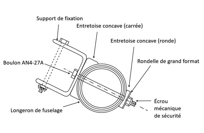 Les instructions du fabricant stipulent que le boulon doit être bien serré, pas plus. Elles avertissent également de ne pas trop serrer les boulons qui fixent ces supports aux tubes creux et que pas plus de 2 filets ne devraient être visibles au-delà de l'écrou. Au moins 5 ou 6 filets étaient visibles sur le boulon de ce [support] de l'avion à l'étude. De plus, le bout du tube creux était déformé et prenait une forme ovale plutôt que ronde. Les boulons des autres [supports] n'avaient que 2 filets visibles et l'on pouvait desserrer les écrous à la main, conformément aux instructions du fabricantNote de bas de page 15.