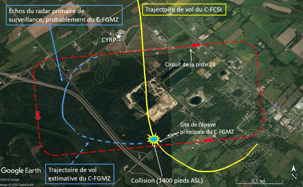 Trajectoires de vol du Piper (C-FCSL) et du Cessna (C-FGMZ). La    section extérieure de l'aile gauche du C-FGMZ a été retrouvée à    635 pieds au sud-ouest du site de l'épave principale. (Source :    Google Earth, avec annotations du BST)