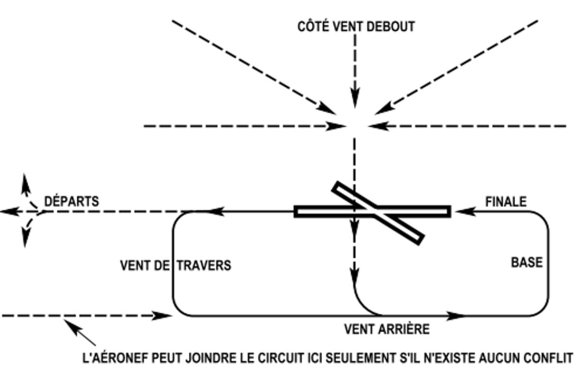 Un pilote « qui utilise un aéronef à un aérodrome ou dans son voisinage doit surveiller la circulation d'aérodrome afin d'éviter les collisionsNote de bas de page 7 »; les pilotes « sont censés effectuer leur approche et atterrir sur la piste en serviceNote de bas de page 8 ». De plus, aux aérodromes situés à l'extérieur d'une zone de fréquence obligatoire (MF)Note de bas de page 9, « l'approche du circuit d'aérodrome devrait se faire du côté vent deboutNote de bas de page 10 » (figure 3).