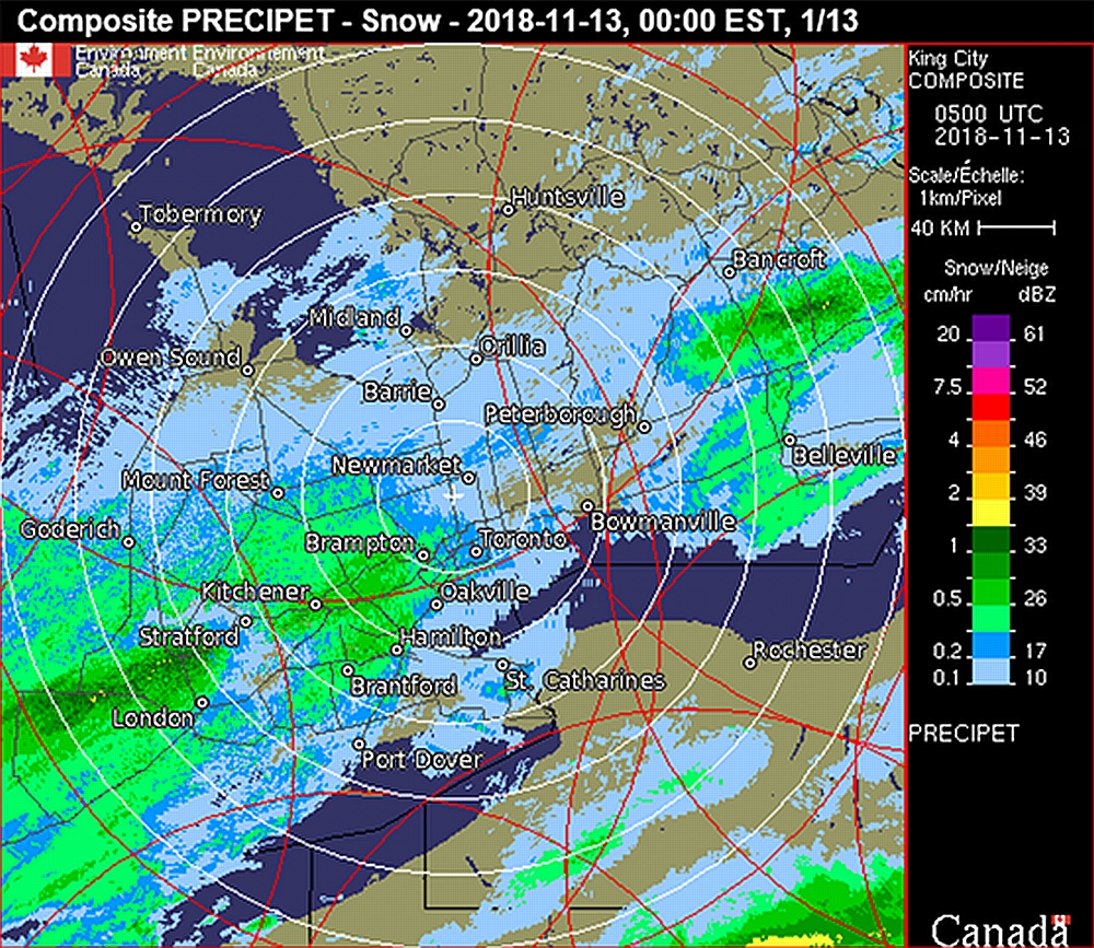 Les données historiques de radar météorologique (figure 1) font état de précipitations, soit de la pluie, soit de la neige faible à CZBA au moment du départ. Les messages d'observation météorologique régulière pour les 3 stations les plus proches faisaient état de visibilités réduites à aussi peu que 1 mille terrestre dans des averses de neige, des plafonds de nuages à 1900 pieds, des vents légers et des températures extérieures autour de 0 °C à la surface.