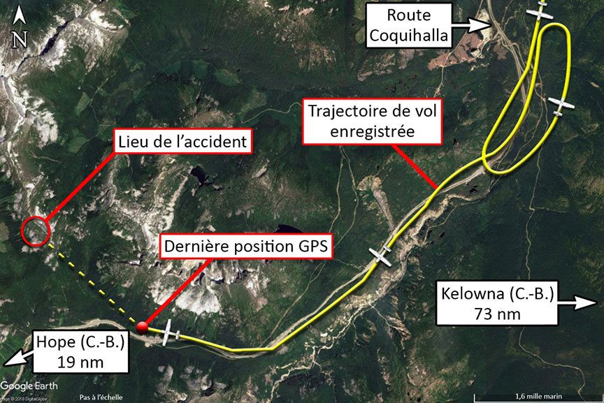 Lorsque l'aéronef se trouvait au nord-est de l'aéroport de Kelowna (CYLW) (Colombie-Britannique), le pilote a demandé un suivi des vols au contrôle de la circulation aérienneNote de bas de page 2. Les services de suivi des vols et radar ont pris fin lorsque l'aéronef est sorti de la portée radar, soit à environ 26 milles marins (nm) au nord-est de Hope (Colombie-Britannique).