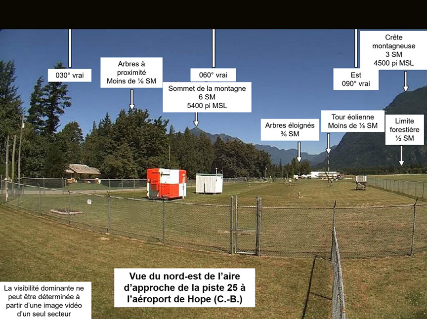 NAV CANADA exploite un système automatisé d'observations météorologiques et des caméras météo à l'aéroport de Hope (CYHE) (Colombie-Britannique). La figure 2 et la figure 3 présentent des vues du nord-est enregistrées par les caméras de NAV CANADA par temps clair et le jour de l'événement.