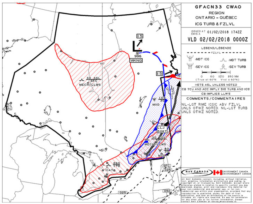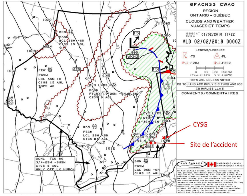 Les prévisions de zone graphique (GFA) sont un outil mis à la disposition des pilotes qui représente les conditions météorologiques générales à venir sur une zone géographique donnéeNote de bas de page 8. Le jour de l'accident, les GFA émises à 12 h 42 et valides à 19 h (annexes A et B) prévoyaient, dans la zone située entre le front froid et la rive nord du fleuve Saint-Laurent, les conditions météorologiques suivantes :