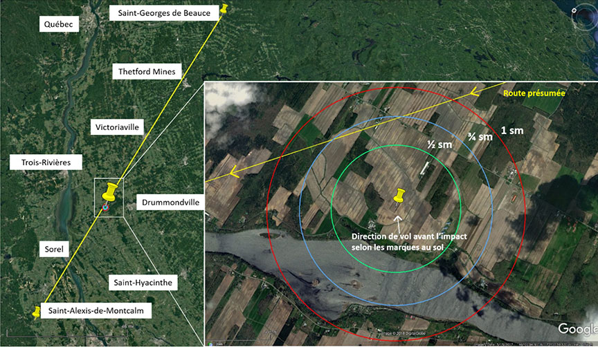 Le 1er février 2018, vers 19 h 45, heure normale de l’Est, l’hélicoptère Robinson R44 Raven I (immatriculation C-GYMG, numéro de série 2081), en exploitation privée, a décollé de Saint-Georges de Beauce (Québec) avec à son bord le pilote et 2 passagères pour un vol de nuit selon les règles de vol à vue à destination de Saint-Alexis-de-Montcalm (Québec). À 20 h 32, le Centre canadien de contrôle des missions a capté un signal de détresse émis par la radiobalise de repérage d’urgence de l’hélicoptère. Vers 21 h 35, l’hélicoptère a été retrouvé dans un champ à Saint-Joachim-de-Courval (Québec), près de Drummondville (Québec). L’hélicoptère a été détruit par les forces d’impact et par un incendie qui s’est déclaré après l’impact. Tous les occupants ont subi des blessures mortelles.