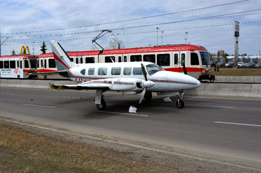 L'aéronef s'est posé sur la 36e Rue N.-E. en direction nord, juste au nord de l'intersection avec la promenade Marlborough N.-E. Peu de temps après le poser, l'aile droite de l'aéronef a percuté un lampadaire du côté droit de la route, arrachant du coup 4 pieds de l'extrémité de l'aile. L'aéronef a poursuivi sa course vers le nord, a franchi l'intersection de la promenade Marbank N.-E. avant de s'immobiliser juste au sud de la bretelle d'accès de la 16e Avenue N.-E. en direction est, qui fait partie de la route Transcanadienne (figure 1).