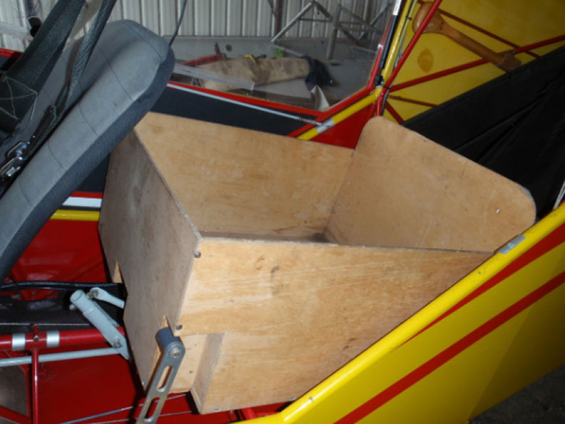 Durant les préparatifs pour le vol de retour, on a retiré le siège arrière de l'aéronef pour le remplacer par une boîte de rangement en bois, que l'ancien propriétaire avait utilisé à plusieurs reprises (figure 2). Cette boîte était fixée à la structure du plancher de l'aéronef à 4 points de fixation qui correspondaient à ceux du siège retiré. Tous les dossiers historiques de l'aéronef se trouvaient dans un sac à dos arrimé dans la boîte, avec les articles de voyage personnels du pilote.