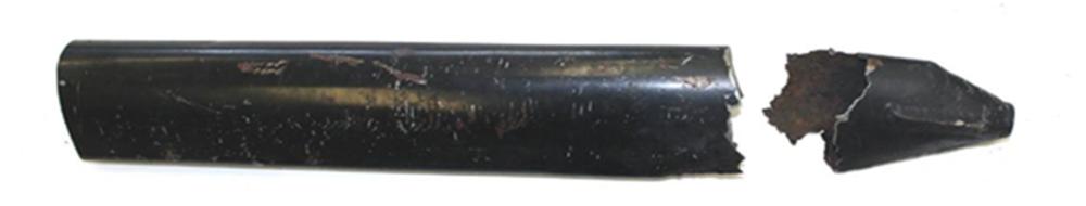 - Dans la zone corrodée de la moitié supérieure du mât de voilure rompu, l'épaisseur de la paroi était de 0,021 à 0,031 pouce; ainsi, l'épaisseur à certains endroits était inférieure au minimum requis. Des essais de perforation effectués dans cette zone n'ont produit aucun enfoncement apparent.