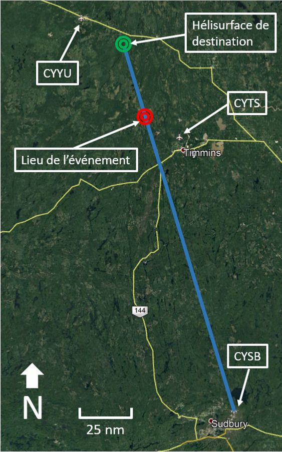 Le 4 mars 2019, l'hélicoptère R66 de la Robinson Helicopter Company (immatriculation C-GAUA, numéro de série 0142), sous exploitation privée, a quitté l'aéroport de Sudbury (CYSB) (Ontario) à 18 h 42Note de bas de page 1 pour un vol selon les règles de vol à vue (VFR) vers une hélisurface privée située près de Fauquier-Strickland (Ontario), avec le pilote et 1 passager à bord. L'hélicoptère a percuté le relief à 20 h 06, 36 milles marins (nm) au sud-sud-est de sa destination (figure 1).