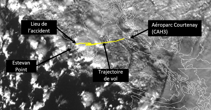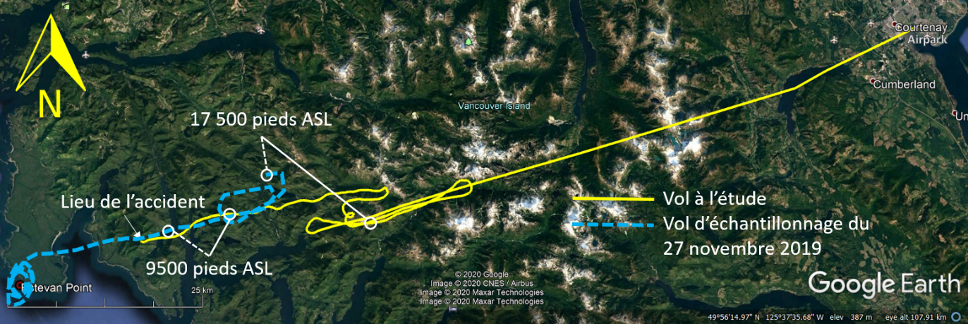 Le 21 décembre 2019, l’aéronef Cessna 172H d’immatriculation privée (immatriculation C-GECG, numéro de série 172-55070) effectuait un vol selon les règles de vol à vue (VFR) à partir de l’aéroparc Courtenay (CAH3), en Colombie-Britannique, avec seulement le pilote à bord. Peu de temps après son départ de CAH3, l’aéronef est apparu sur le radar à 11 h 32 Note de bas de page 2, franchissant 1900 pieds ASL. À 12 h 03, l’équipage de conduite a mis l’avion en palier à 17 400 pieds ASL. Pendant les 15 minutes suivantes, il a suivi la trajectoire de vol prévue pour la mission d’échantillonnage de l’air selon une trajectoire conforme aux vols précédents d’échantillonnage de l’air, y compris un changement de code de transpondeur à 12 h 14.