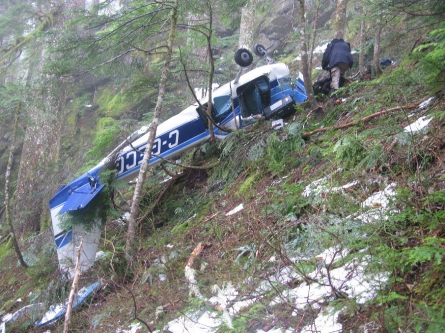 L’épave a été retrouvée à environ 2600 pieds ASL sur le flanc abrupt et densément boisé d’une montagne, à 31 milles marins (NM) au nord-ouest de l’aéroport de Tofino/Long Beach (CYAZ), en Colombie-Britannique. Les dommages étaient typiques d’un impact de faible énergie (figure 2).