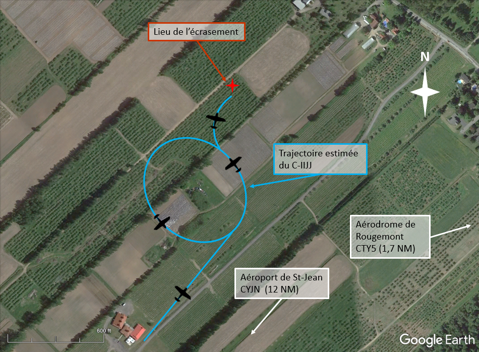 Vers 11 h 25, le pilote a décollé de sa piste privée pour un vol VFR local dans le secteur de Rougemont, avec le propriétaire comme passager. Vers 11 h 33, l’avion aurait survolé un verger à Rougemont à basse altitude (c.-à-d. moins de 200 pieds au-dessus du sol) en tournant dans le sens antihoraire. Vers 11 h 35, l’avion a changé de sens et a tourné en direction nord-est. Il a perdu de l'altitude et s'est écrasé dans les arbres du verger (figure 1). Les 2 occupants ont subi des blessures mortelles. Aucun signal provenant de la radiobalise de repérage d’urgence (ELT) n’a été capté.