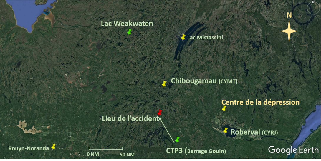 À 13 h, le centre d’une dépression quasi stationnaire se trouvait à environ 37 milles terrestres (SM) au nord de l’aéroport de Roberval (CYRJ) (Québec) (figure 1). Les régions à l’ouest et au nord-ouest de la dépression étaient sous l’influence d’un retour nuageux favorisé par un taux d’humidité élevé, qui était de 87 % à CTP3 et de 100 % près du lieu de l’accident. La présence locale de brume, de bruine ou de pluie intermittente était également possible dans ces régions, ce qui pouvait réduire la visibilité et abaisser le plafond nuageux. Entre 13 h et 17 h, l’aéroport de Chibougamau/Chapais (CYMT) (Québec), situé à environ 43 milles marins (NM) au nord du lieu de l’accident, a rapporté une visibilité variant entre 2 ½ SM et 9 SM, un plafond à 400 pieds au-dessus du sol (AGL) ainsi que de faibles précipitationsNote de bas de page 3 intermittentes.