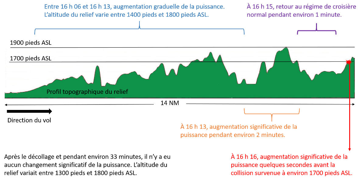 En se basant sur le trajet estimé en ligne droite et en comparant les données du système d’enregistrement et de surveillance des paramètres moteur, les vitesses-sol estimées et la topographie, on remarque une corrélation entre la manipulation de la manette des gaz et la topographie du relief (figure 2). On remarque aussi que l’altitude de l’avion par rapport au relief a diminué au fur et à mesure qu’il progressait.