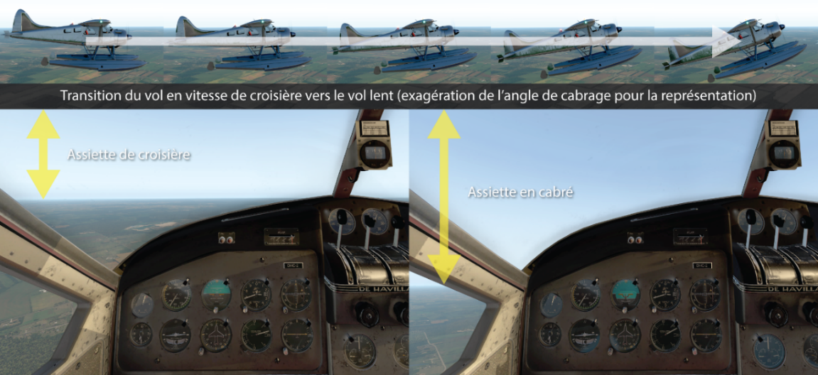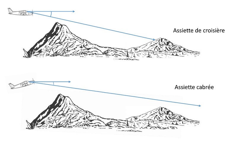 En vol lent, l’aéronef est plus cabré que lorsqu’il vole à la vitesse de croisière. La position cabrée modifie la position de l’horizon visible depuis le poste de pilotage ainsi que la surface terrestre visible (figure 3). L’horizon et la surface terrestre constituent donc les principaux indices visuels qu’utilise le pilote pour déterminer l’assiette de l’avion. S’il voit l’horizon se déplacer vers le bas du pare-brise et la surface terrestre visible diminuer au-dessus du tableau de bord, le pilote peut reconnaître la position cabrée de l’aéronef.