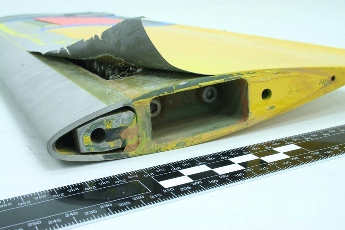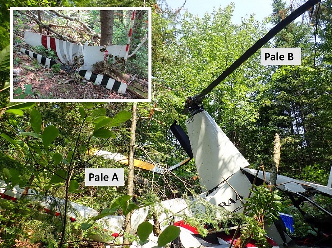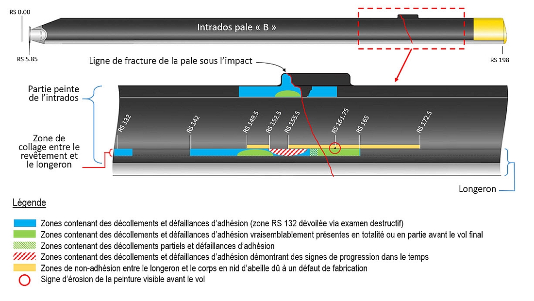 Lors de l’examen, l’une des pales a révélé de multiples défaillances d’adhésion sur la même section, non reliées à l’impact avec les arbres lors de la descente.