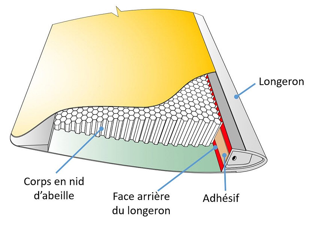 Lors de la fabrication des pales, les revêtements de l’extrados et de l’intrados sont superposés aux joints de collage le long du longeron, du renfort de bord de fuite et du capuchon d’extrémité, et sont maintenus en place avec un adhésif vaporisé. Le corps en nid d’abeille est également fixé à la face arrière du longeron avec de l’adhésif pour assurer la solidité de l’ensemble (figure 4).