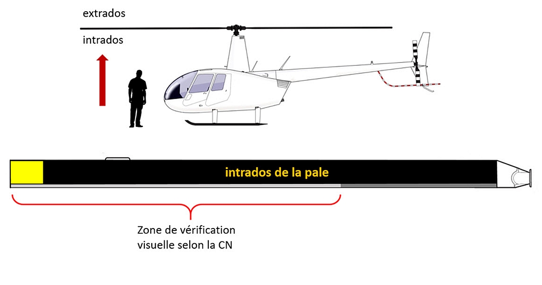 Avant le premier vol de chaque journée, une inspection visuelle des pales à l’intrados devait être effectuée afin de détecter toute mise à nue de la surface métallique au niveau du joint de collage entre le revêtement et le longeron, tel qu’exigé dans la CN 2014-23-16. Il était également requis d’effectuer et d’inscrire au carnet de route les actions afin de maintenir la validité du certificat de navigabilité de l’aéronef. Si l’inspection visAvant le premier vol de chaque journée, une inspection visuelle des pales à l’intrados devait être effectuée afin de détecter toute mise à nue de la surface métallique au niveau du joint de collage entre le revêtement et le longeron, tel qu’exigé dans la CN 2014-23-16. Il était également requis d’effectuer et d’inscrire au carnet de route les actions afin de maintenir la validité du certificat de navigabilité de l’aéronef. Si l’inspection visuelle révélait la présence d’une érosion importante de la peinture laissant paraître une surface métallique, la pale devait être inspectée par un technicien avant le vol. Si le technicien constatait un décollement ou de minuscules trous, la pale devait être retirée du service immédiatement.