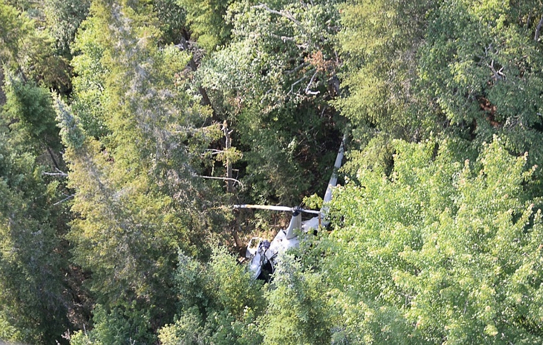 Des morceaux de branches de petit diamètre couvraient l’épave et ses alentours immédiat lorsque les premiers répondants sont arrivés sur les lieux. Le corps du pilote se trouvait à l’intérieur de l’aéronef dans son siège avec sa ceinture de sécurité attachée, tandis que le corps du passager a été trouvé environ 66 mètres plus loin. Tous les débris de l’aéronef étaient dispersés autour de l’épave sur une courte distance. Les enquêteurs du BST n’ont relevé aucune trace au sol ou autre indice pouvant indiquer une quelconque vitesse longitudinale ou latérale au moment de l’impact. Seule la cime des arbres dans le secteur situé au-dessus de l’épave présentait des signes d’impact.