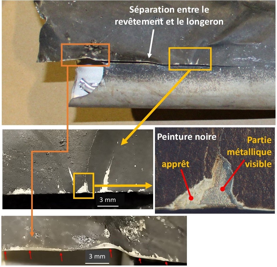 Ces défaillances ont mené à la séparation de certaines sections du joint entre le revêtement de l’intrados et le longeron permettant à l’humidité de s’infiltrer sous le revêtement ce qui, au fil du temps, a causé la dégradation de l’adhésion au joint de collage.
