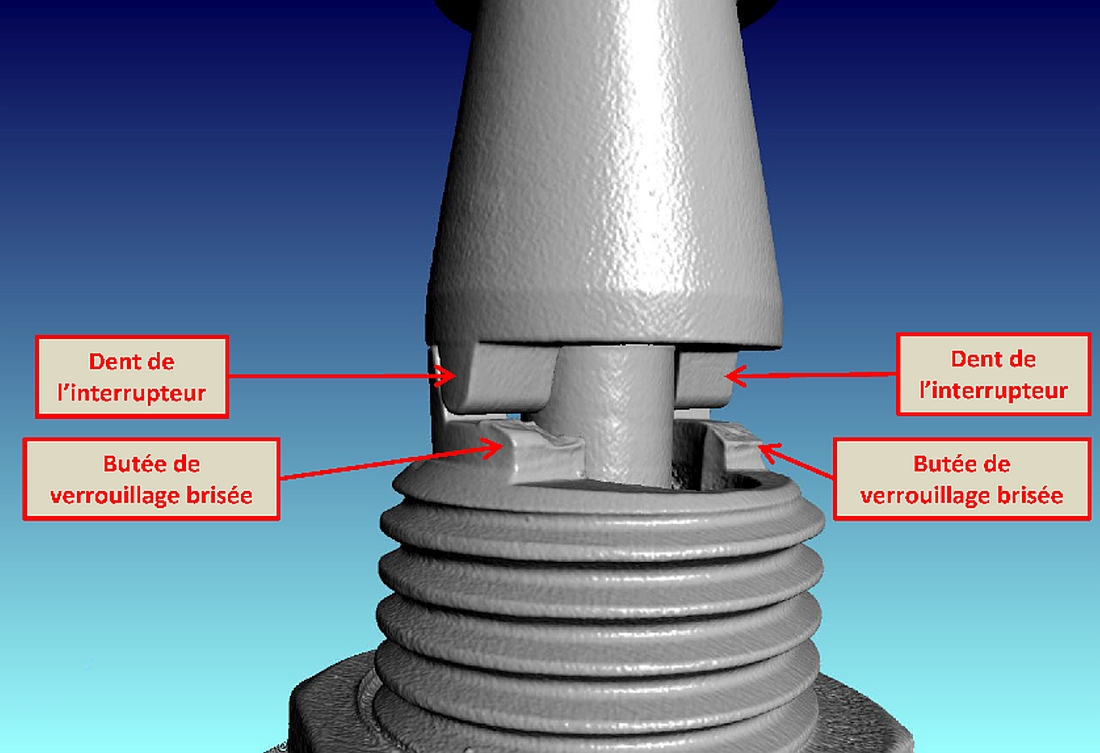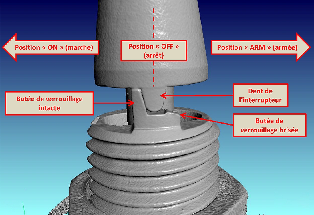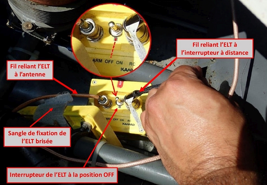 Les tests effectués sur l’ELT en cause ont permis de déterminer que les butées de verrouillage de l’interrupteur de l’ELT, entre la position OFF et la position ARM, étaient brisées depuis un moment, ce qui permettait à l’interrupteur de basculer entre les 2 positions sous l’effet d’une force minimale de 1,8 G. Sachant que l’interrupteur était à la position ARM moins de 4 mois avant l’accident, il est raisonnable de croire que ce dernier a basculé à la position OFF lors de l’accident puisque la force subie à l’impact était bien supérieure à la force minimale de 1,8 G.