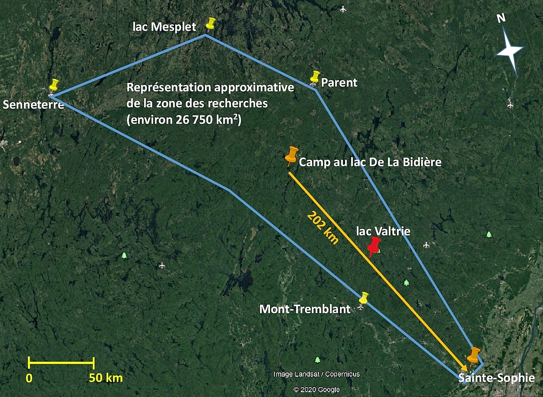 Les équipes de recherches de la SQ ont finalement retrouvé l’aéronef le 25 juillet, soit 14 jours après que celui-ci eut été porté disparu, dans un secteur boisé près du lac Valtrie (Québec) (figure 1). Les occupants ont été trouvés sans vie. L’aéronef a été détruit.