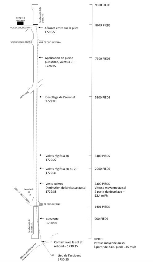 À 17 h 28, lorsque l’avion a été autorisé à décoller, les vents soufflaient toujours du 210 °M à 15 nœuds, avec rafales à 20 nœuds. Le pilote aux commandes a amorcé la course au décollage à 7300 pieds de l’extrémité de la piste.
