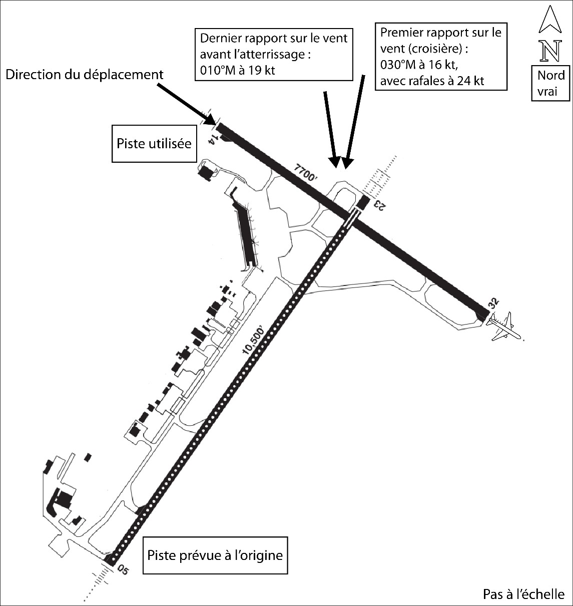 À l’approche de l’aéroport, l’équipage de conduite a reçu de nouveaux renseignements météorologiques indiquant un plafond plus bas. Étant donné que ce plafond était inférieur aux minimums publiés pour l’approche vers la piste 05, l’équipage de conduite a demandé d’effectuer l’approche ILS (système d’atterrissage aux instruments) vers la piste 14. L’enquête a permis de déterminer que les vents indiqués par le contrôleur du centre de contrôle régional à ce moment-là (020° magnétiques [M] à 17 nœuds, avec rafales à 27 nœuds) engendraient une composante vent arrière de 15 nœuds pour la piste 14.
