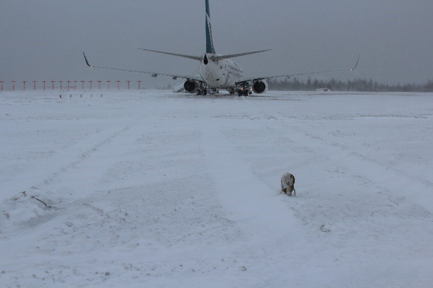 À 11 h 27, l’aéroport a publié un compte rendude l’état de la surface de la piste (RSC) indiquant que les 160 pieds du milieu des 2 pistes, de 200 pieds de largeur chacune, étaient couverts à 100 % d’une trace de neige mouillée, et que le reste de la largeur de chaque côté était à 100 % couvert de 2 pouces de neige mouillée.