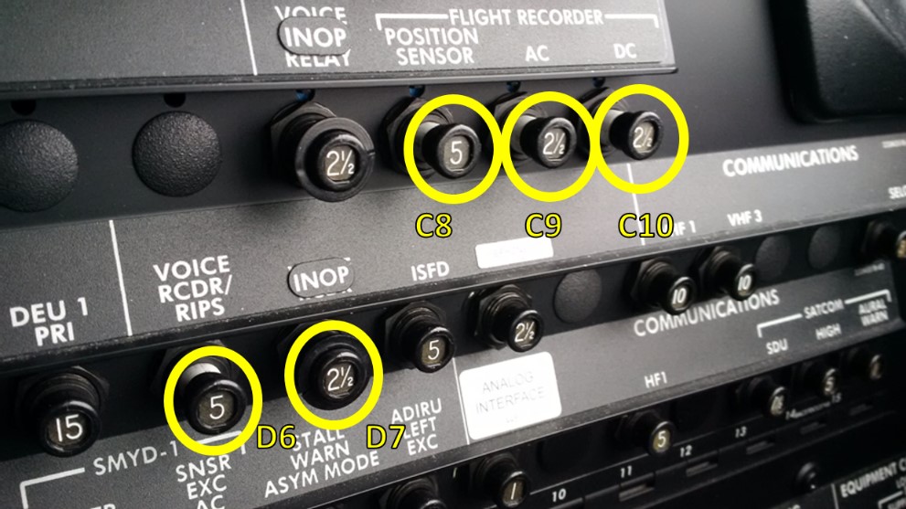 En attendant les autobus, l’équipage de conduite s’affairait à effectuer la coordination avec la compagnie et la tour. L’équipage de conduite a reçu un message ACARS du contrôleur de maintenance demandant de couper l’alimentation électrique de l’enregistreur de conversations de poste de pilotage (CVR) et de l’enregistreur de données de vol (FDR) en tirant les disjoncteurs C7, C8, C9 et C10Note de bas de page 10. L’équipage de conduite a tiré les disjoncteurs indiqués dans le message de maintenance; toutefois, sur cet aéronef, le disjoncteur du CVR se trouvait à l’emplacement D6. Par conséquent, l’alimentation du CVR a été maintenue, et l’enregistrement de l’approche et de l’atterrissage a été écrasé.
