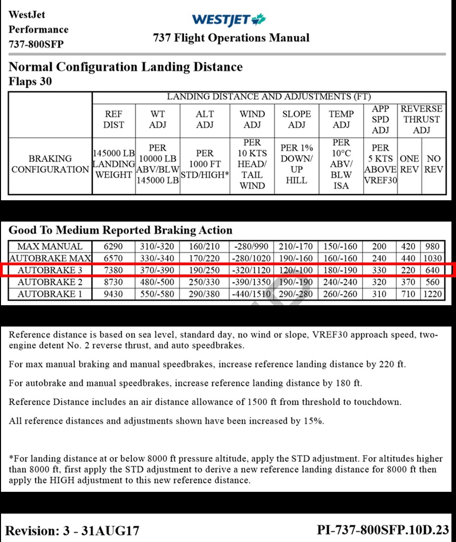 Source : WestJet Airlines Ltd., 737 NG Flight Operations Manual – 737NG Quick Reference Handbook, révision 6 (18 juin 2019), Performance – Normal Configuration Landing Distance, p. PI-737-800SFP.10D.23, avec annotations du BST.