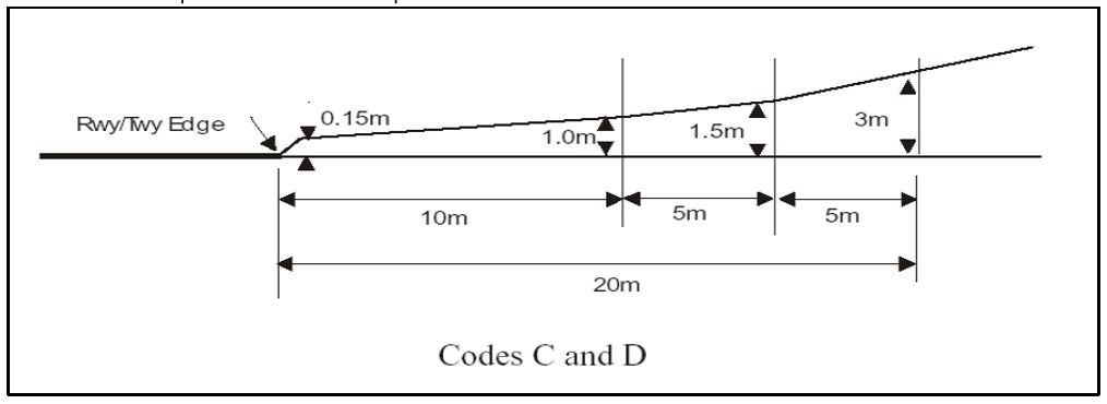 Le plan de maintenance hivernaleNote de bas de page 6 de la Division des aéroports du Nunavut est commun à tous les aéroports exploités par la Division. Le plan de maintenance hivernale a été préparé à l’aide de la Circulaire d’information no 302-013Note de bas de page 7 de TC à titre de document d’orientation. Tous les aéroports du Nunavut, à l’exception de ceux de Grise Fiord (CYGZ) et de Kimmirut (CYLC), se sont vus attribuer les codes C et DNote de bas de page 8. Le code fait référence à l’envergure maximale ou à la largeur hors-tout du train principal des aéronefs qui peuvent être exploités à partir de l’aéroportNote de bas de page 9. Le plan de maintenance hivernale contient un diagramme de l’Organisation de l’aviation civile internationale (OACI) indiquant que la profondeur maximale de la neige peut être de 0,15 m près du bord de la piste, puis augmenter jusqu’à 1,0 m à une distance de 10,0 m du bord de la piste (figure 2).