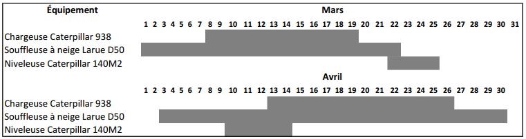 En cas de besoin, le personnel de maintenance de l’aéroport peut également louer de l’équipement additionnel appartenant au hameau. La chargeuse du hameau a été louée 4 fois en mars et en avril 2020. Le bouteur du hameau a été loué 4 fois en avril 2020.