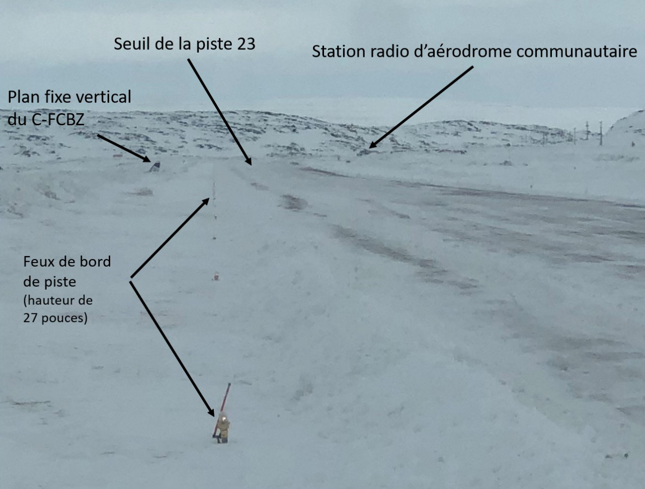 Au cours de la descente, l’équipage de conduite a activé les feux de piste et le système d’indicateur de trajectoire d’approche de précision (PAPI) au moyen du système de balisage lumineux d’aérodrome télécommandé (ARCAL). Le commandant de bord a réglé les volets pour l’approche (40 %), et le premier officier a piloté la descente. Lorsque le commandant de bord a confirmé le contact visuel avec la piste, de la neige soufflait sur celle-ci en diagonale de gauche à droite. La piste elle-même se présentait comme une forme noire dans de la poudrerie. Étant donné ces circonstances, le balisage lumineux de piste et le PAPI n’ont pas pu être observés. Le commandant de bord a réglé les volets pour l’atterrissage (100 %), puis, dans le cadre de la procédure d’approche surveillée par le pilote, il a pris les commandes de l’aéronef en qualité de pilote aux commandes. Le premier officier a levé les yeux des instruments et, à travers la poudrerie, il a observé la piste ainsi que la station radio d’aérodrome communautaire et l’aire de trafic de l’aéroport à l’avant et vers la gauche.