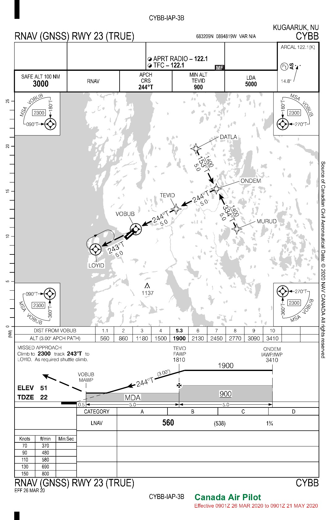 L’équipage utilisait la carte d’approche pour l’approche RNAV (GNSS) [système mondial de navigation par satellite] vers la piste 23 à CYBB (annexe A) publié dans le volume 1 du Canada Air Pilot (CAP 1), qui couvre le Yukon, les Territoires du Nord-Ouest et le Nunavut.