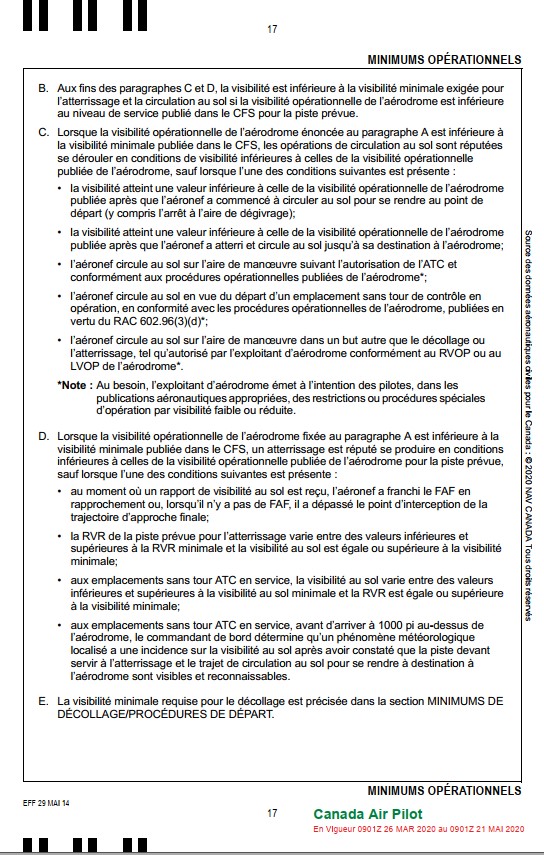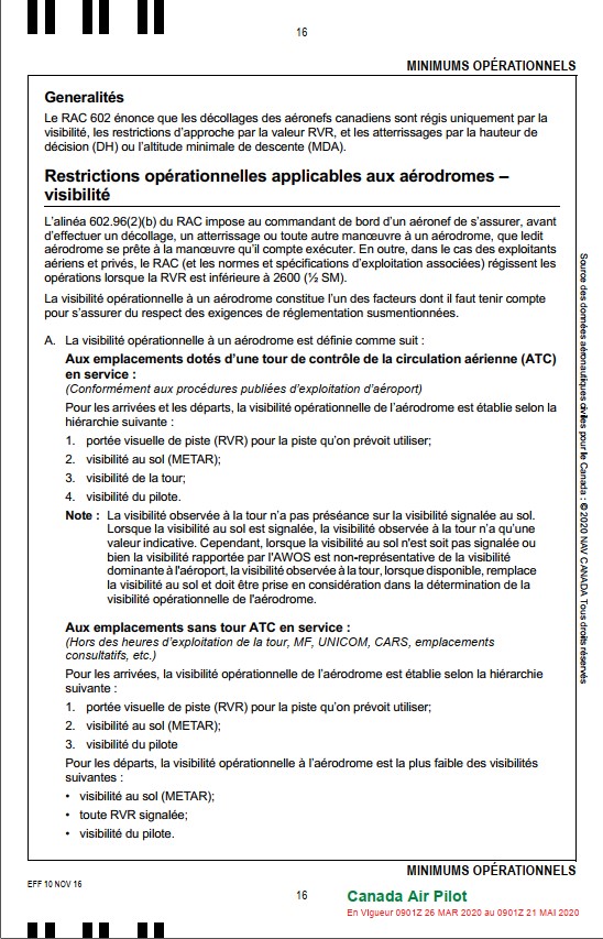 Annexe B – Canada Air Pilot, pages générales du CAP (CAP 6 : Québec), Restrictions opérationnelles applicables aux aérodromes – visibilité