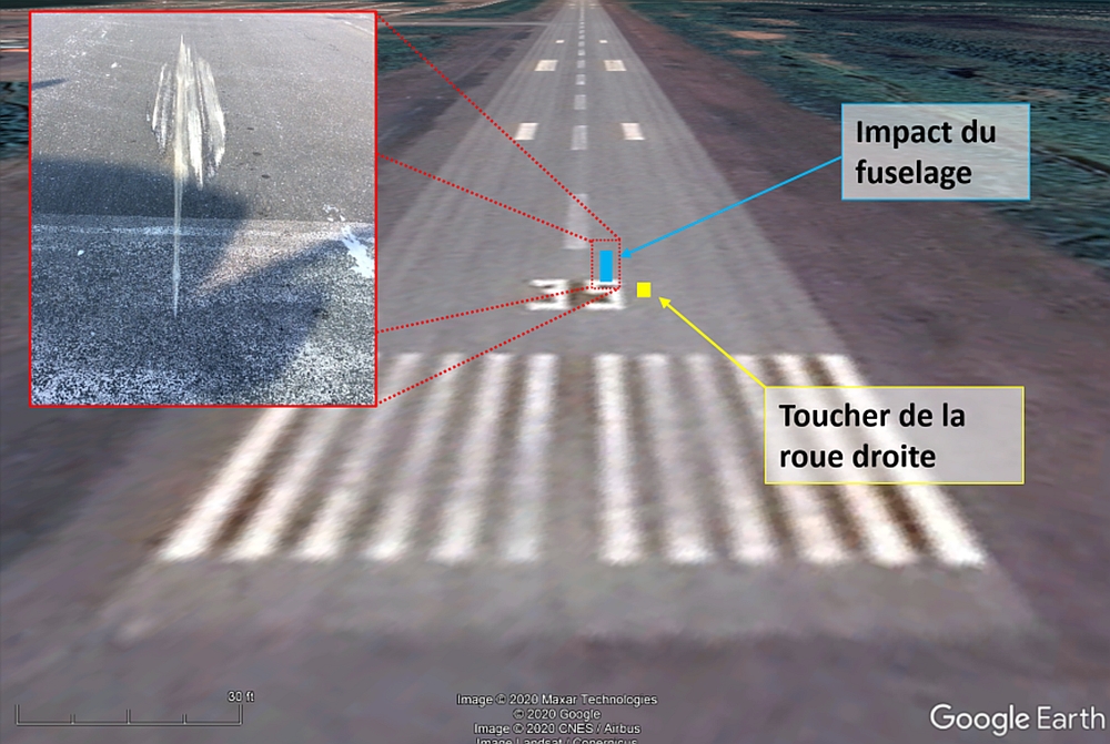 À 11 h 09 min 16 s, l’aéronef a effectué un atterrissage brutal avec une assiette de 9° en cabré, au cours duquel la partie arrière inférieure du fuselage est entrée en contact avec la piste. Lors du roulage sur la piste, l’équipage a remarqué le voyant « Touched Runway » du système de contact du fuselage avec la piste qui s’était illuminé.
