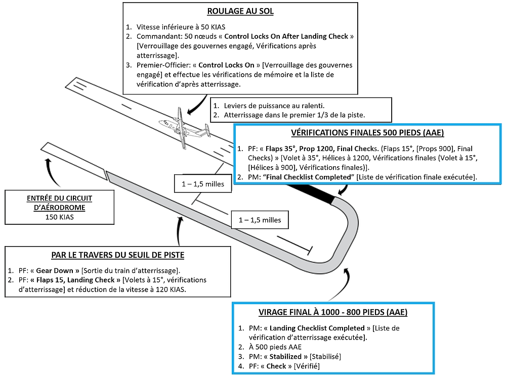- Les procédures d’utilisation normalisées du Dash 8 ont été révisées afin d’améliorer les directives sur plusieurs sujets dont les approches visuelles et l’identification des points désignés d’approche stabilisée.