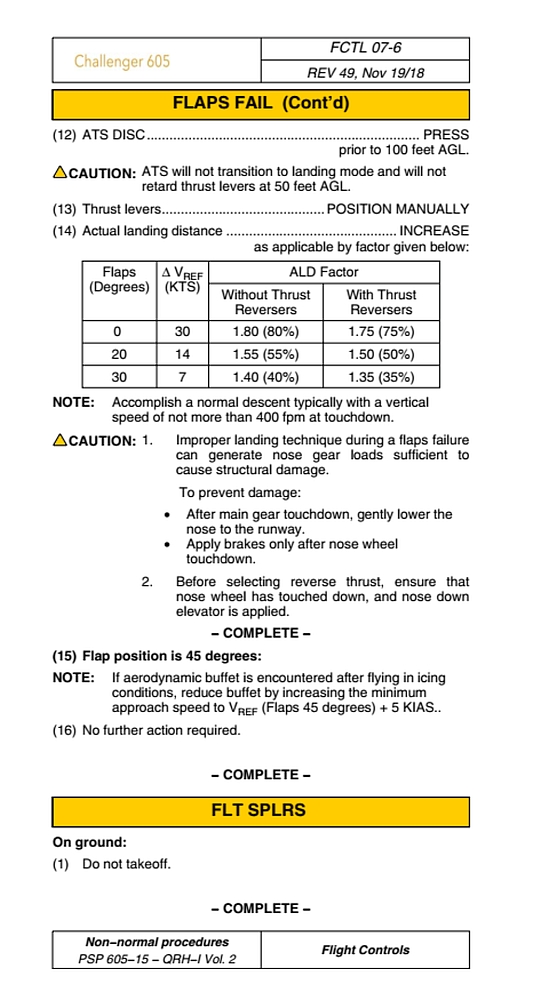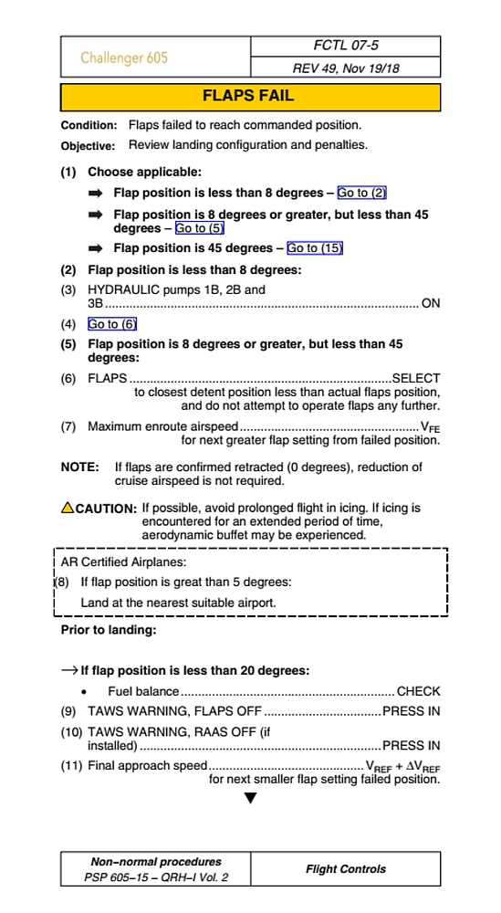 Source : Bombardier Inc., Bombardier Challenger 605 Quick Reference Handbook, Non-normal procedures, volume 2, révision 49 (19 novembre 2018).