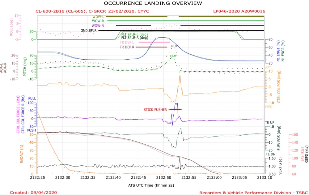 - Le simulateur de vol Challenger 605 utilisé pour la formation périodique ne représentait pas avec précision les caractéristiques de comportement de l’aéronef sans volets au moment du déploiement des inverseurs de poussée, ce qui n’était d’ailleurs pas requis pour la certification. Par conséquent, l’équipage de conduite n’était pas convenablement préparé pour empêcher le cabrage qui s’est produit lors du déploiement des inverseurs de poussée, ou pour s’en rétablir.