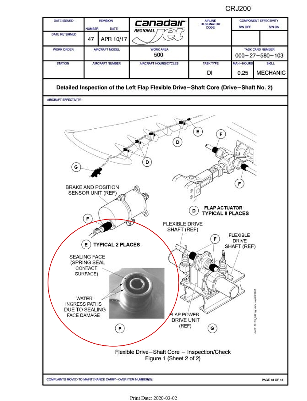 La tâche 275000-202 exige une inspection détaillée des arbres d’entraînement flexibles de volet à un intervalle de 2400 heures de volNote de bas de page 10. La tâche d’inspection doit être effectuée conformément à la tâche 27-53-07-220-801 du manuel de maintenance de l’aéronefNote de bas de page 11 et comprend le retrait et l’inspection visuelle du noyau interne de l’arbre d’entraînement flexible de volet. En cas de présence évidente de graisse sèche ou dure dans le noyau interne, le noyau doit être nettoyé, inspecté et entretenu avant d’être réinstallé dans l’aéronef.