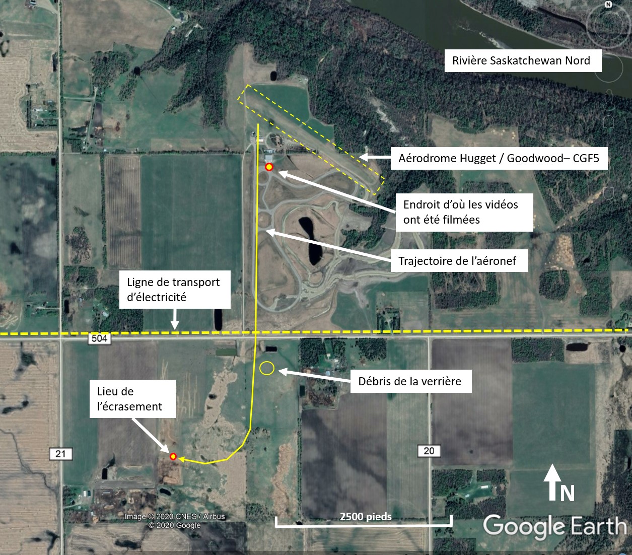Après le 2e circuit, l’aéronef a tourné à gauche, est descendu à environ 25 pieds au-dessus du sol (AGL) et a survolé du nord au sud la ligne droite de la piste de course. D’après les vidéos enregistrées par les observateurs au sol, à l’extrémité sud de la ligne droite, l’aéronef a amorcé une montée et a heurté le plus élevé des 2 fils d’une ligne de transport d’électricité non marquée sur le côté nord du chemin de canton 504 à une altitude de 32 à 35 pieds AGL (figure 1). L’aéronef s’est cabré et a monté jusqu’à une altitude d’environ 700 pieds tout en roulant à droite jusqu’à une assiette presque inversée et en changeant de cap vers l’ouest. Lorsque l’aéronef a commencé à descendre, il a roulé à gauche jusqu’à avoir les ailes à l’horizontale et a continué à descendre jusqu’à ce qu’il percute le sol, dans une assiette en piqué de 40°.