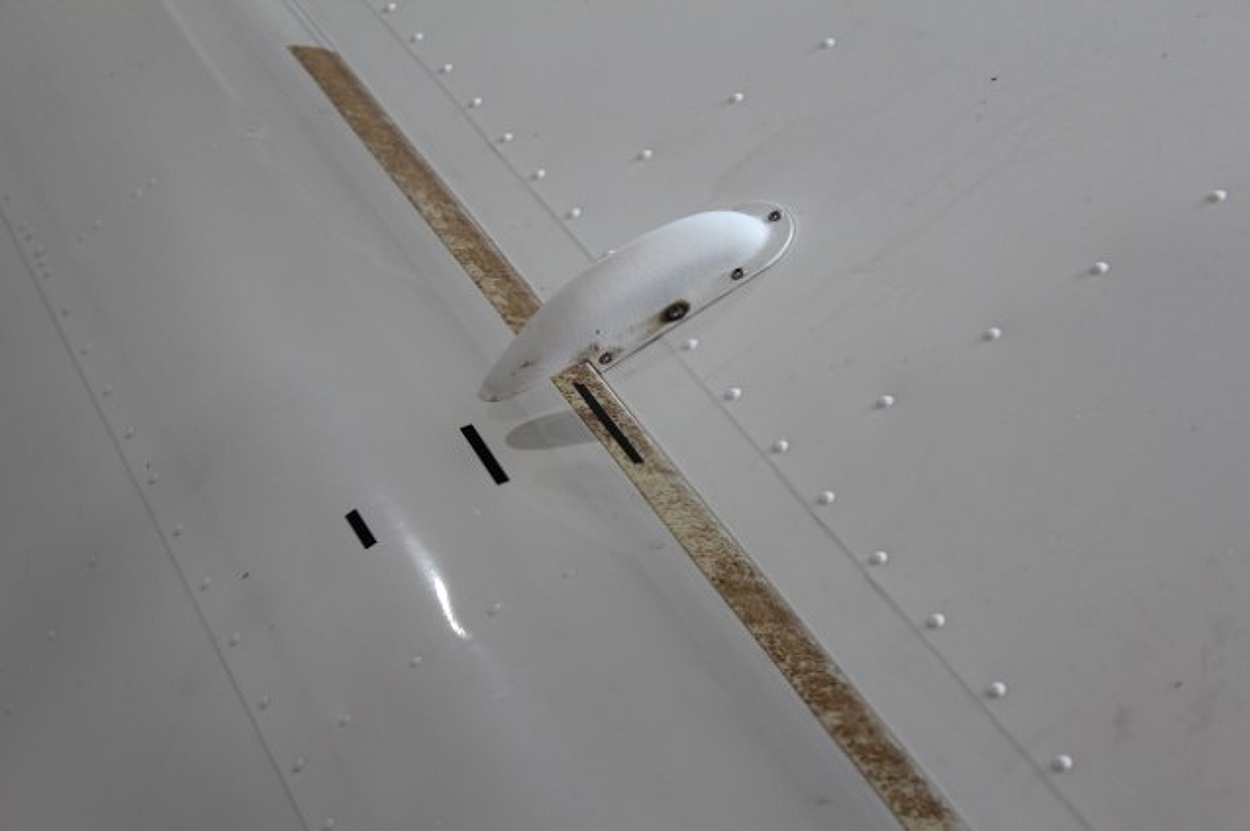 Le pilote règle la position des volets en maintenant le commutateur à ressort de rappel vers l’avant en position UP pendant la rentrée des volets, ou en maintenant le commutateur vers l’arrière en position DOWN pendant leur sortie. Ils se règlent en alignant l’un des indicateurs de position des volets (lignes noires), situés sur le volet gauche, avec le bord de fuite de l’aile (figure 6). Pour braquer les volets à un angle précis, le pilote doit regarder l’indicateur de position des volets par la fenêtre; il n’y a aucune rétroaction haptique, visuelle ou sonore dans le poste de pilotage pour informer le pilote de l’angle de braquage des volets sélectionné. Il faut normalement 2 secondes pour déplacer les volets d’un angle de 10° (6 secondes pour sortir complètement des volets complètement rentrés ou vice versa).